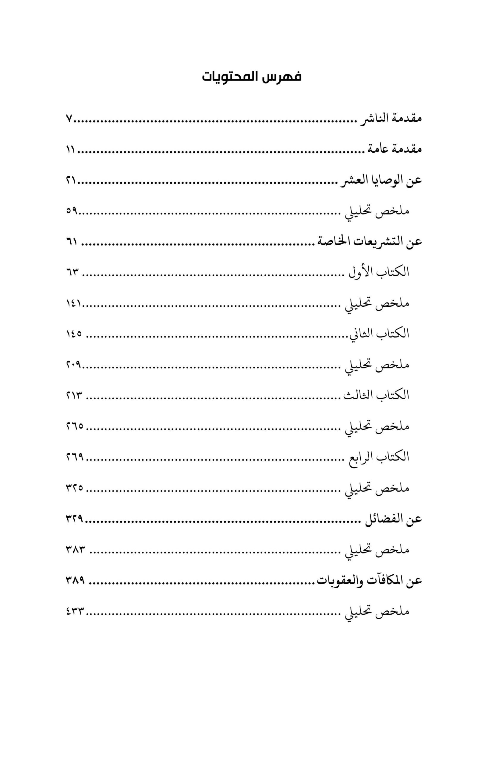 عن الوصايا العشر، عن التشريعات الخاصة، عن الفضائل، عن المكافآت و العقوبات.